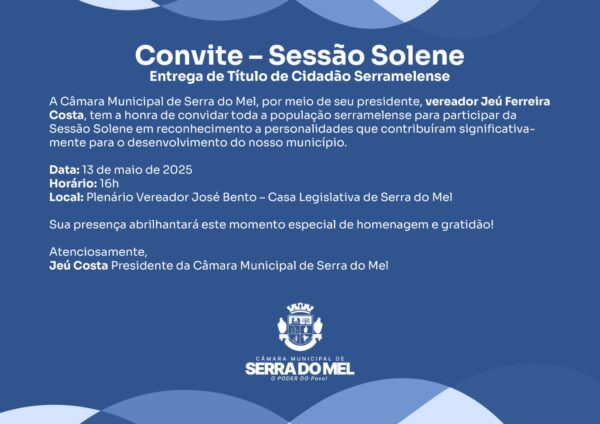"É com grande entusiasmo que assumimos esta nova gestão na Câmara Municipal de Serra do Mel. Nosso compromisso é com a transparência, o diálogo aberto com a população e o fortalecimento do legislativo como instrumento de transformação social. Vamos trabalhar com responsabilidade, ouvindo as demandas do povo e buscando sempre o melhor para o desenvolvimento do nosso município."